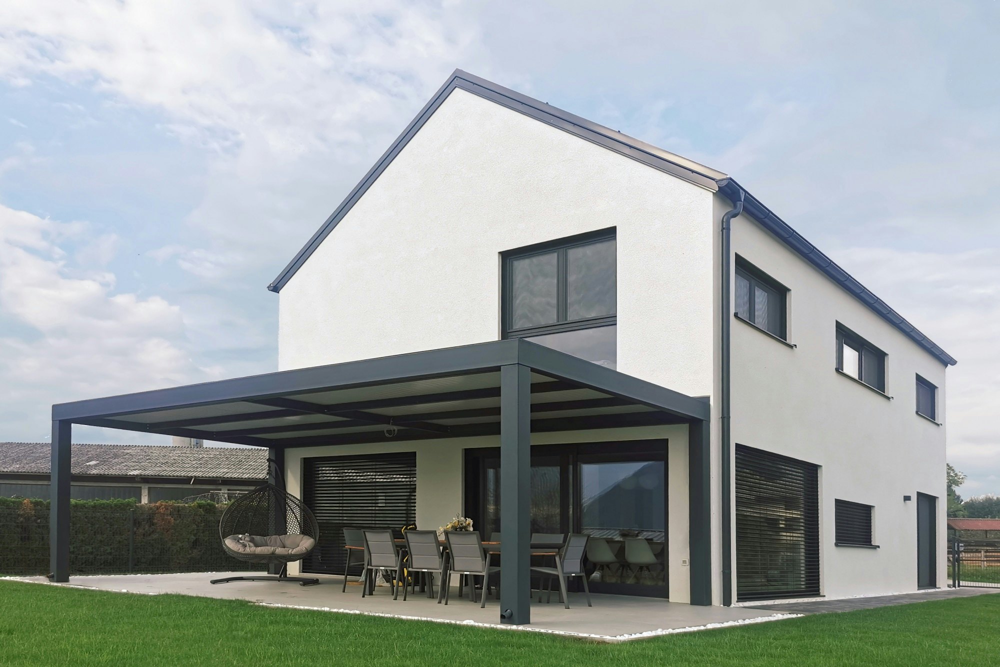 Dieses Haus mit modernsten Energie- und Technologielösungen verfügt über 140 Quadratmeter Wohnfläche. Überragender Komfort wird durch eine vollständige Anpassung an die Erwartungen und Wünsche der Bauherren und eine spezielle architektonische Anpassung an die räumlichen städtebaulichen Anforderungen gewährleistet. Die Giebelform und die harmonischen und schlichten Proportionen mit einzigartigen Details runden den durchdachten Grundriss und die direkte Verbindung zum Außenbereich, die durch eine Überdachung der Terrasse vervollständigt wird, angenehm ab.