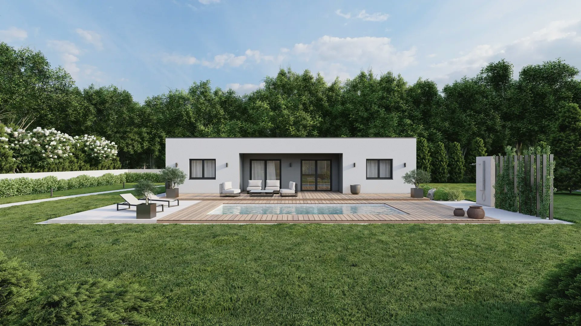In diesen Fertighäusern gibt es separate Rückzugsbereiche für Eltern und Kinder. Die Wohnteile für die Eltern umfassen eigene Bäder, Ankleiden und Vorräume. Offene Wohnküchen in der Mitte sowie überdachte Terrassen schaffen großzügige Bereiche für das gemeinsame Familienleben.